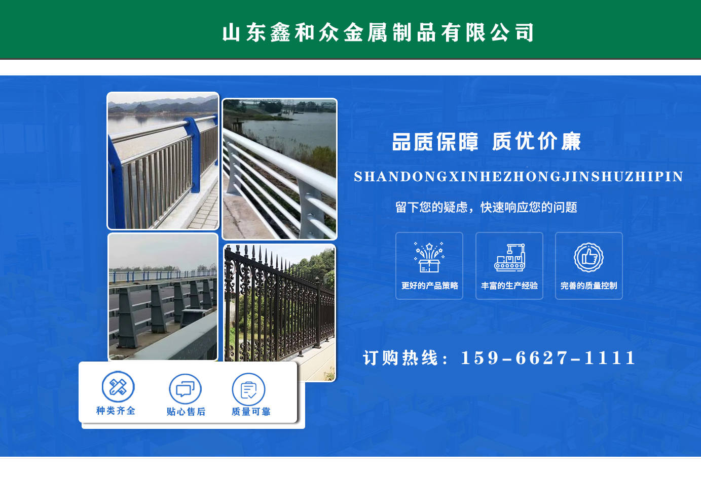 山東鑫和眾金屬制品有限公司主要產(chǎn)品有防撞護(hù)欄,橋梁護(hù)欄,道路護(hù)欄,河道護(hù)欄,不銹鋼護(hù)欄等護(hù)欄。提供設(shè)計(jì)方案,一站式定制,包您滿意價(jià)格優(yōu)惠,歡迎來(lái)電咨詢! 公司常年從事銷(xiāo)售護(hù)欄防撞護(hù)欄,橋梁護(hù)欄,道路護(hù)欄,河道護(hù)欄,不銹鋼護(hù)欄,橋梁鋼護(hù)欄,河道燈光護(hù)欄等。產(chǎn)品廣泛應(yīng)用于橋梁、河道、旅游景區(qū)、道路、公路、公園、小區(qū)、景觀、道路防撞等領(lǐng)域?! 」井a(chǎn)品均采用優(yōu)質(zhì)不銹鋼材料,符合相關(guān)標(biāo)準(zhǔn)。各種型號(hào)不銹鋼復(fù)合管及護(hù)欄,質(zhì)量嚴(yán)格把控。產(chǎn)品強(qiáng)度高、耐腐蝕、焊接牢固、抗沖擊、性能好,防撞護(hù)欄結(jié)構(gòu)簡(jiǎn)單、美觀實(shí)用大方?! g迎前來(lái)訂購(gòu)!...